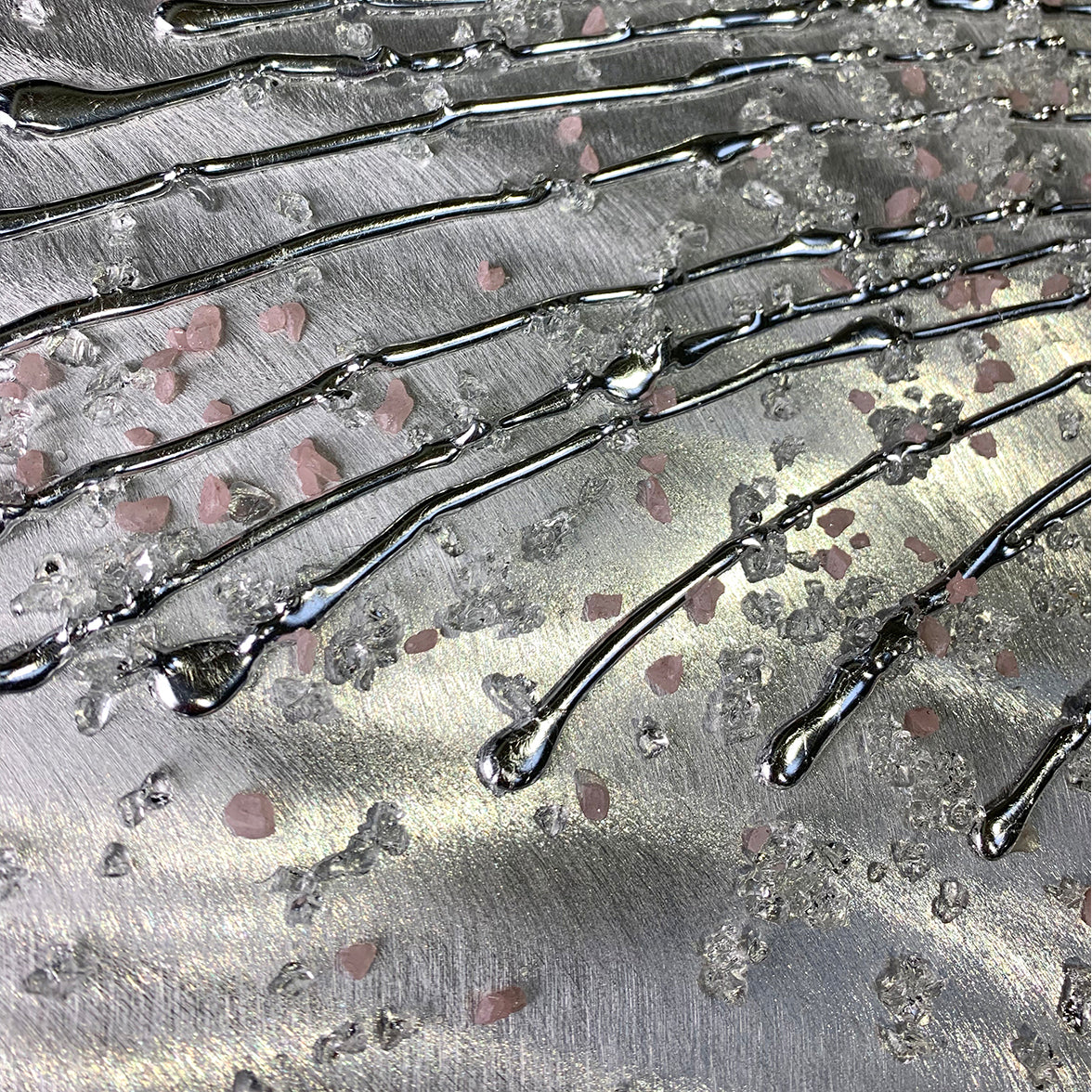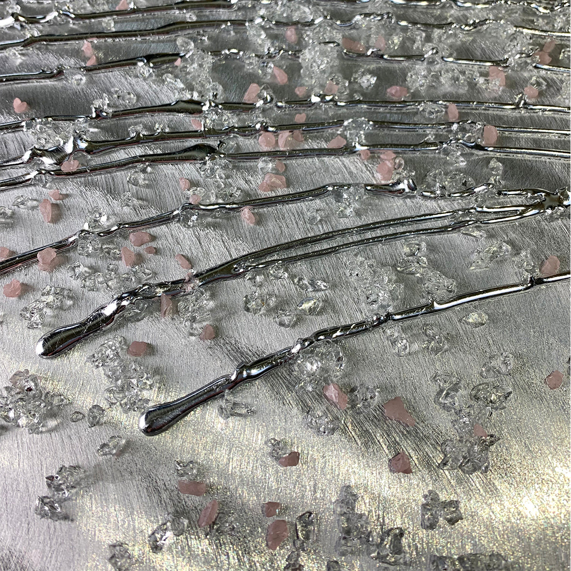 Floated on easy to hang frameworks with luxurious crystal glass textured finish and liquid silver effect raised line embellishments.