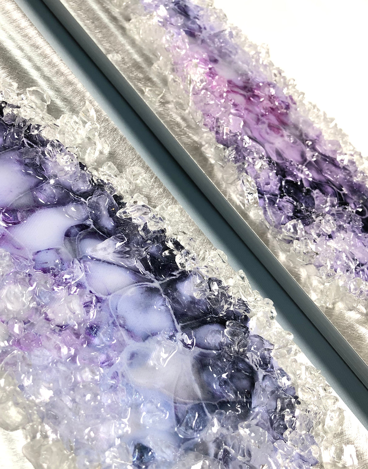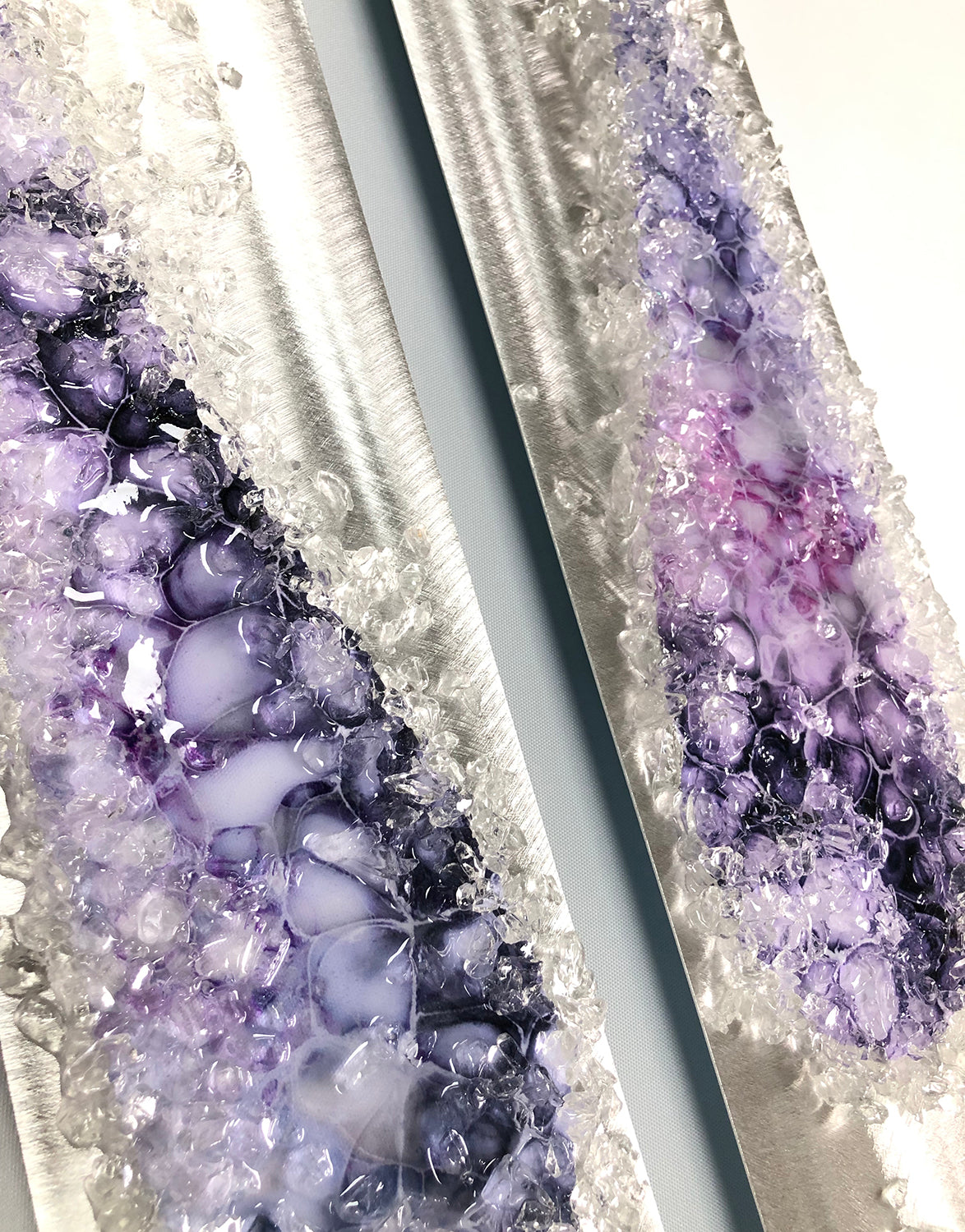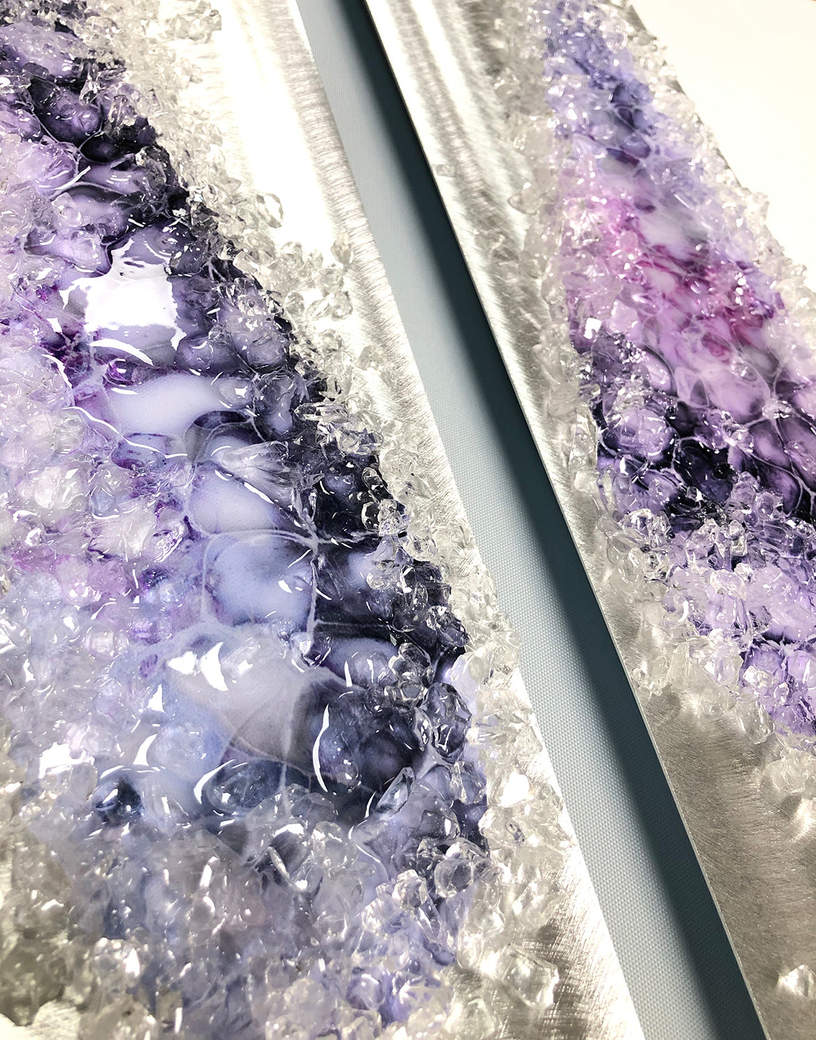 Set of 2 deep floated luxury aluminium artworks with marble effect, cast in resin and embelished with crystal crushed glass.