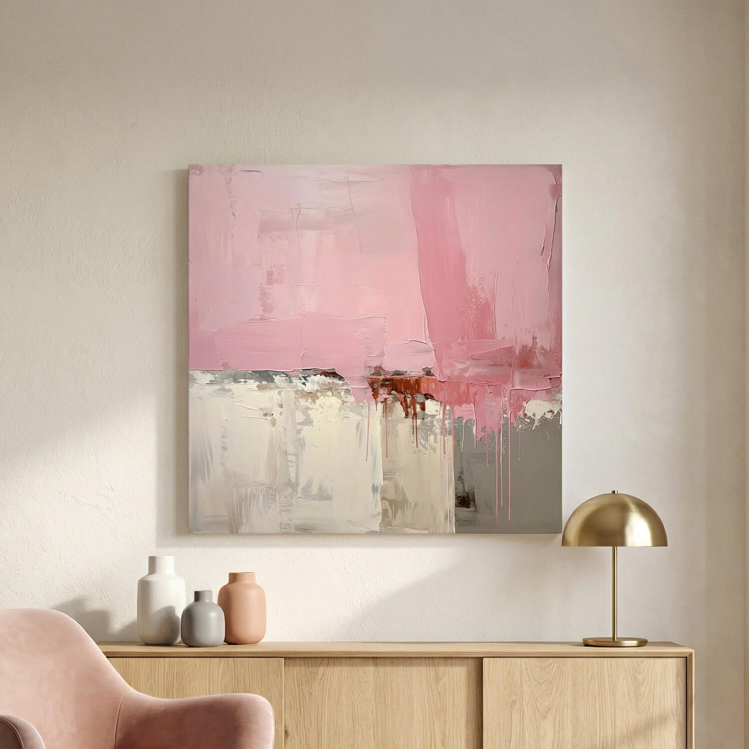 Blush Horizon captures the quiet beauty of soft pink meeting warm neutrals in a layered, contemporary composition. Broad, textured brushstrokes blend blush tones with ivory and muted grey, creating depth through subtle movement and artistic detail. Gentle drips and distressed accents add character, while the contrast between the airy upper half and the grounded base gives the piece a balanced, calming presence.
