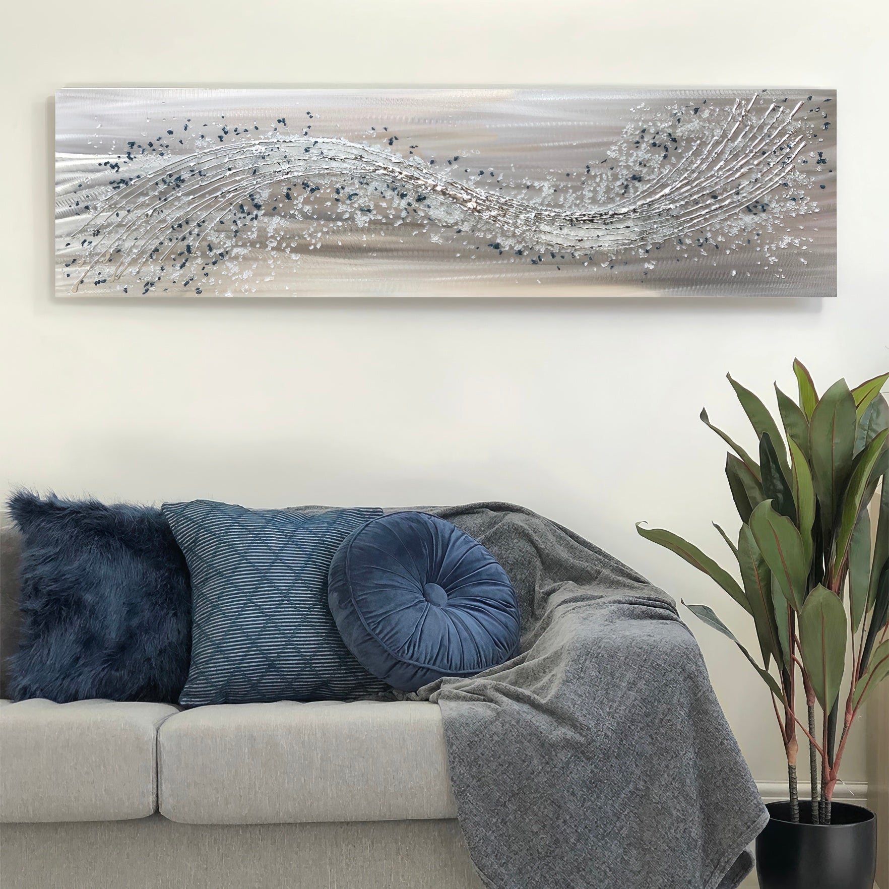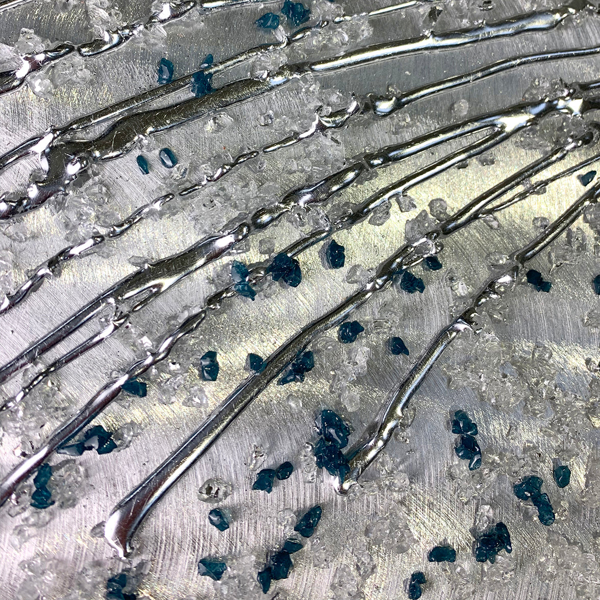 Floated on easy to hang frameworks with luxurious crystal glass textured finish and liquid silver effect raised line embellishments.