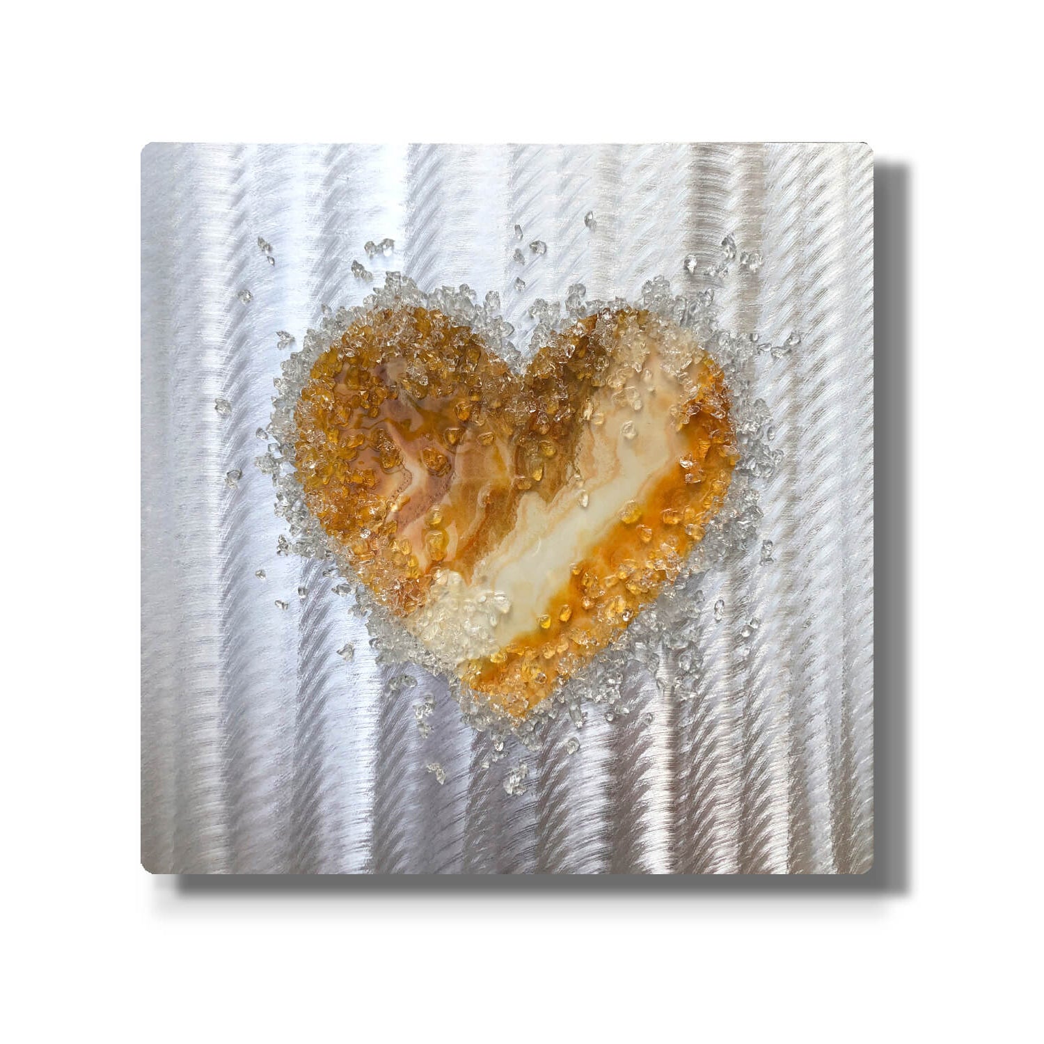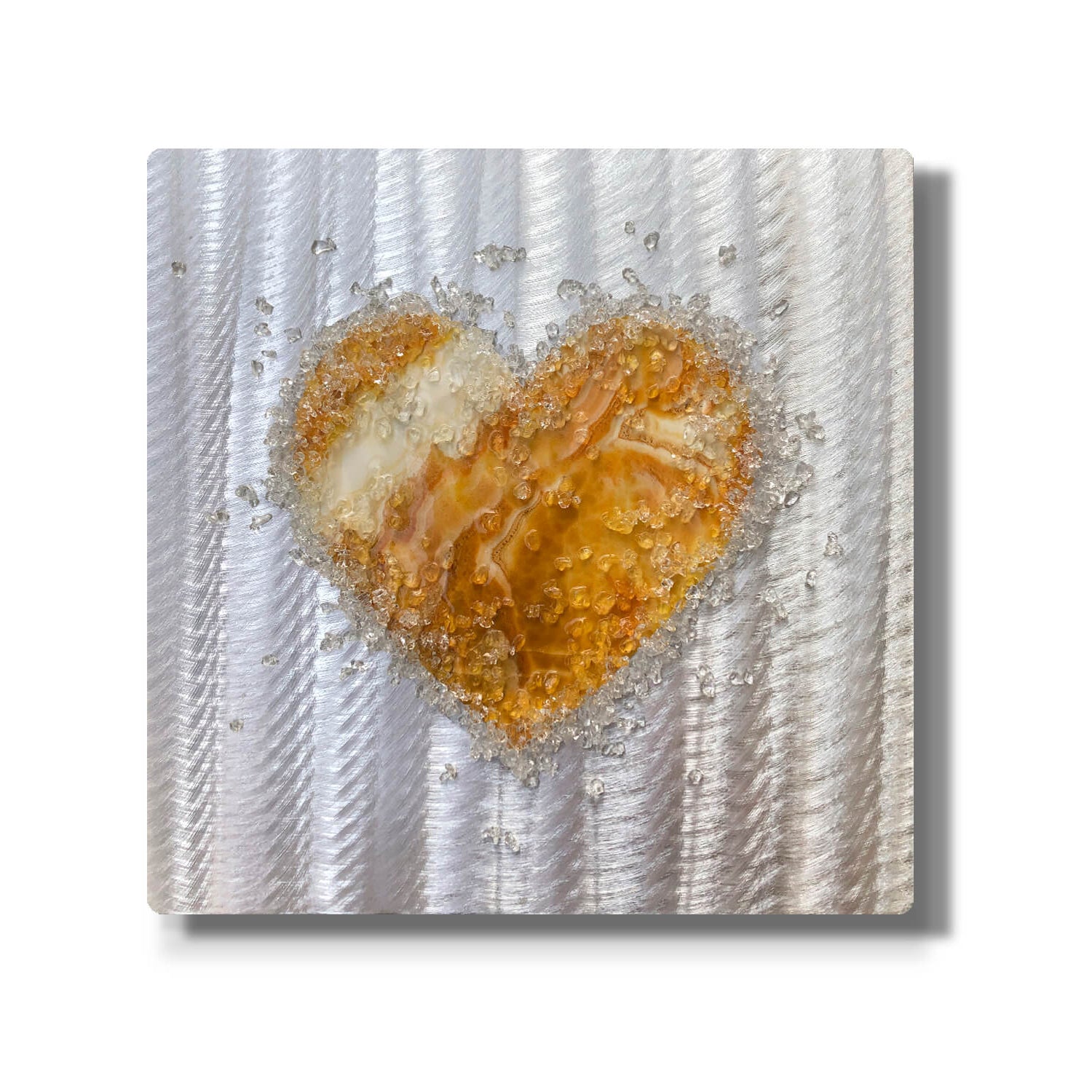 Set of 2 deep floated aluminium love hearts with marble effect, cast in resin and embelished with crystal crushed glass.