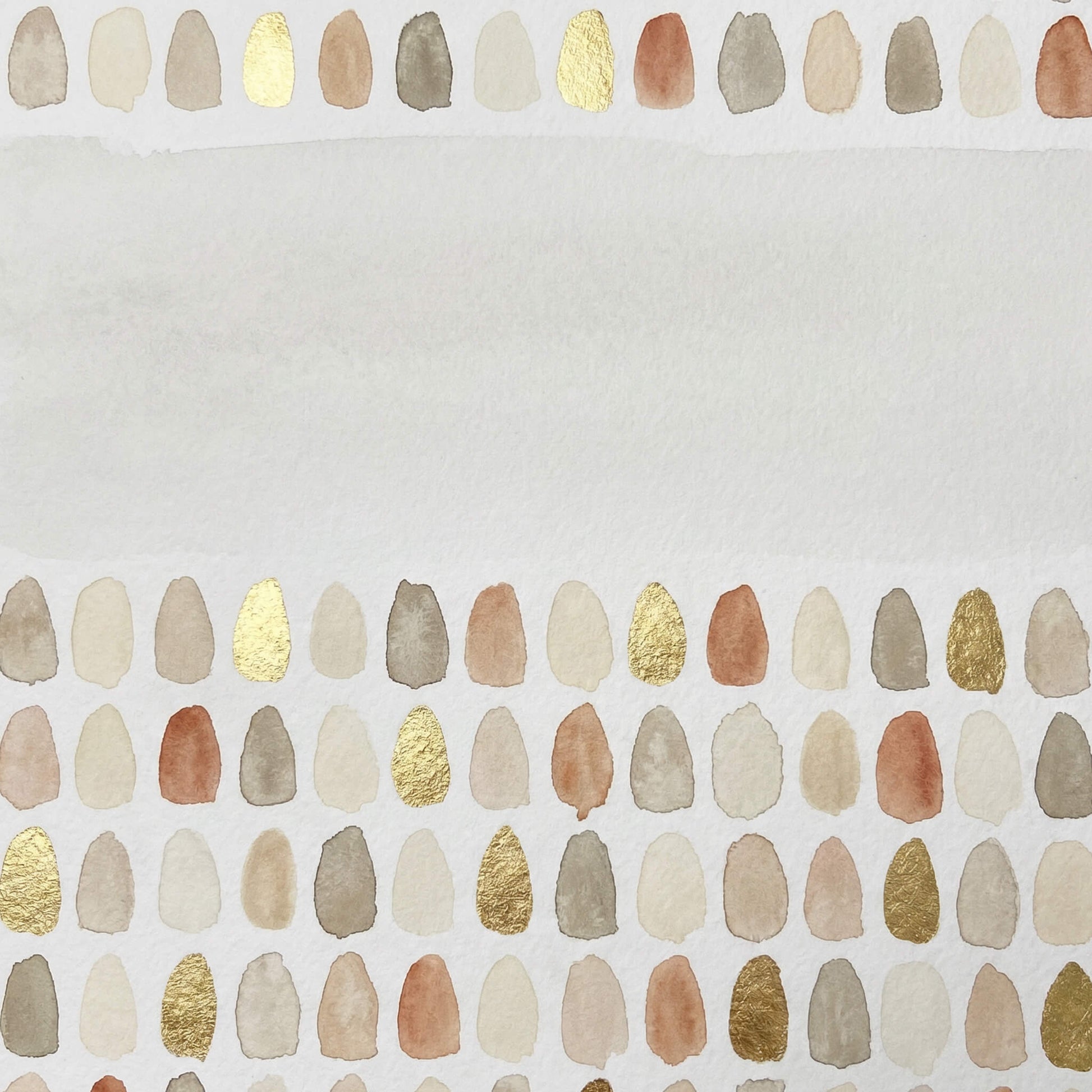 Golden Stillness is an elegant canvas print showcasing a soft, minimalist composition of hand-painted oval motifs arranged in gentle horizontal bands. Set against a warm ivory background, subtle shades of sand, stone, blush, and clay are accented with touches of metallic gold, adding a refined shimmer and quiet sophistication. The open central space creates balance and breathing room, allowing the organic shapes and delicate textures to feel calm and considered.