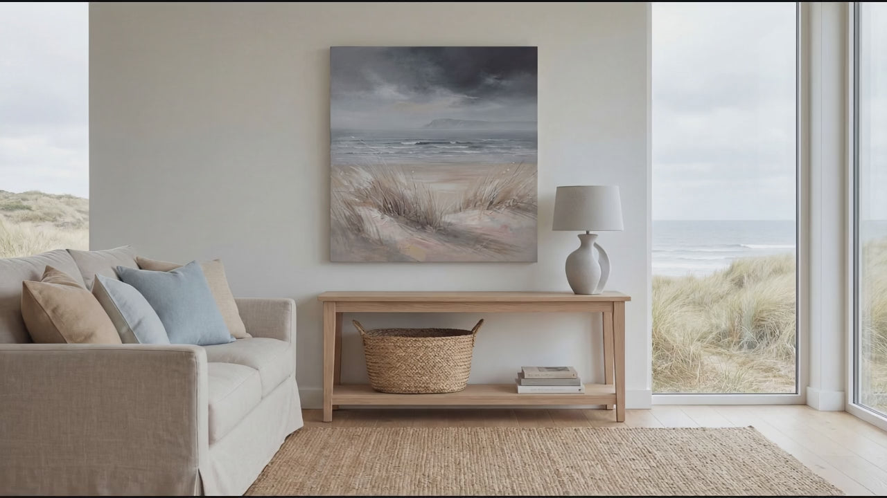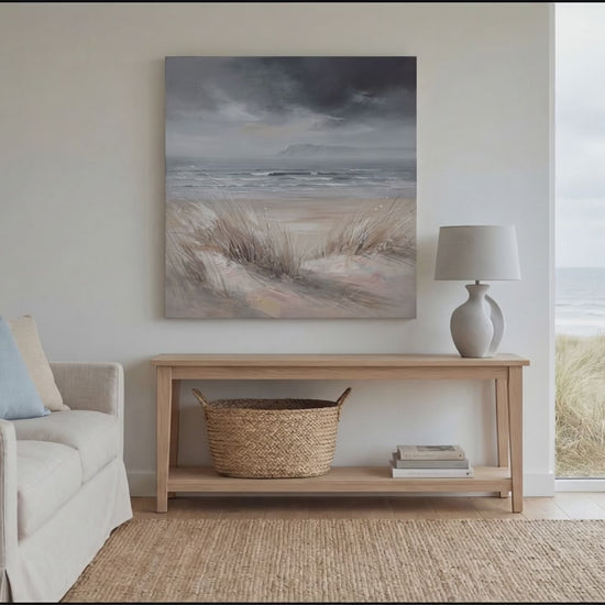 Windswept Horizon captures the quiet drama of a windswept shoreline beneath a brooding sky. Soft dune grasses sway in the foreground, guiding the eye across smooth sand and gentle rolling waves toward distant cliffs fading into mist. A refined palette of warm sandy hues, cool greys, and muted blues creates a beautifully balanced composition that feels both calming and evocative. Subtle texture and expressive brushwork add depth and movement, bringing natural energy to the scene without overwhelming the space.