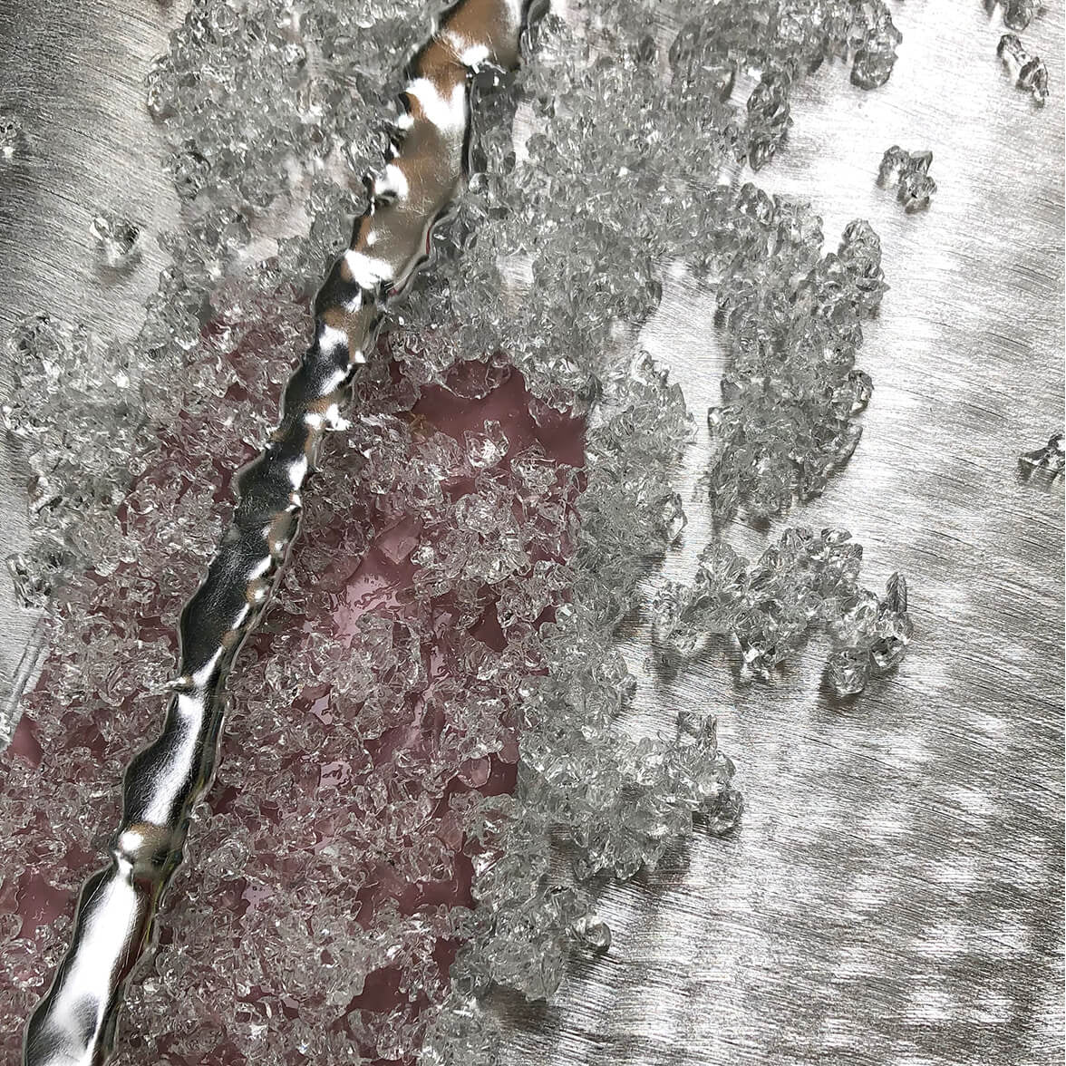 Set of 2 deep floated luxurious aluminium artworks, embellished with crystal crushed glass and ‘liquid silver’ lines.