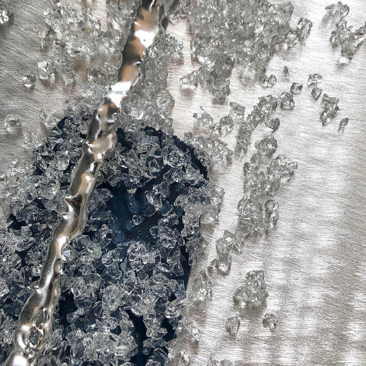 Set of 2 deep floated luxurious aluminium artworks, embellished with crystal crushed glass and ‘liquid silver’ lines.