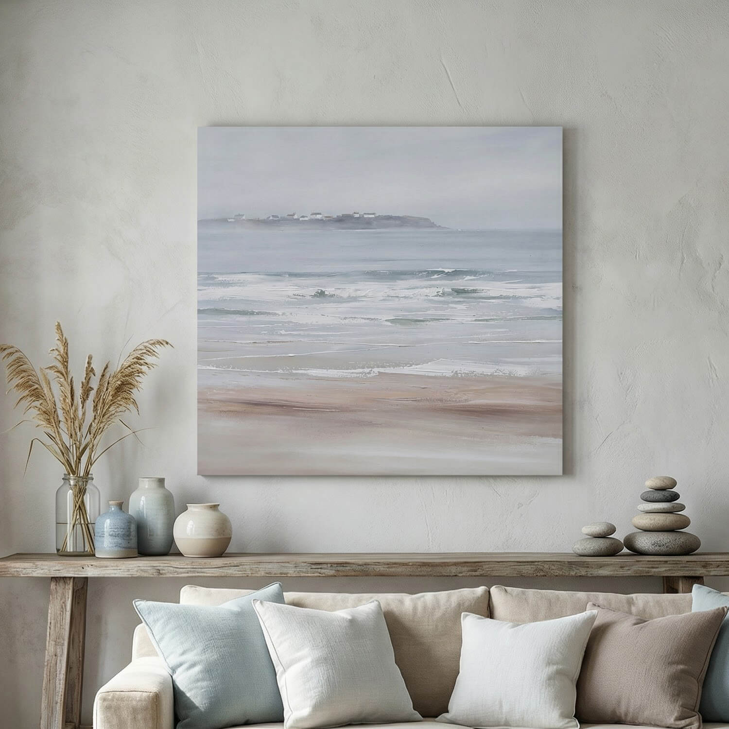 Ideal for a coastal-inspired living room, serene bedroom, hallway, or minimalist sitting area, this canvas pairs beautifully with natural wood tones, linen fabrics, soft neutrals, and ceramic accents. It complements Scandinavian, contemporary, and modern rustic interiors. Perfect for those who appreciate understated seascapes and soothing colours, this artwork brings gentle elegance and a breath of coastal calm to any thoughtfully styled space.