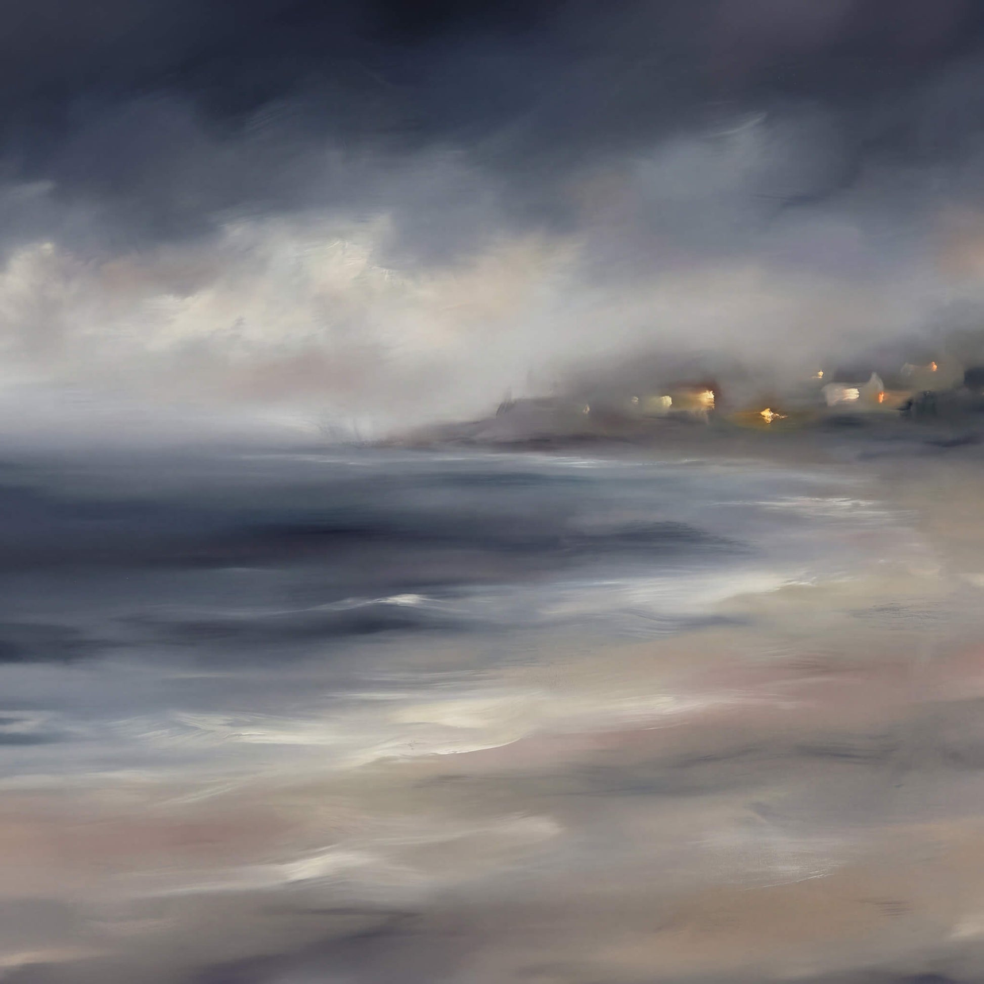 Nightfall by the Sea captures the quiet drama of a misty shoreline at dusk, where rolling waves blur into soft sand beneath a sweeping, cloud-filled sky. Layers of deep blue, smoky grey, and muted blush tones create a beautiful sense of movement and depth, while distant coastal lights glow gently through the haze. The expressive brushwork gives the piece a dreamlike quality, balancing moodiness with a subtle warmth.