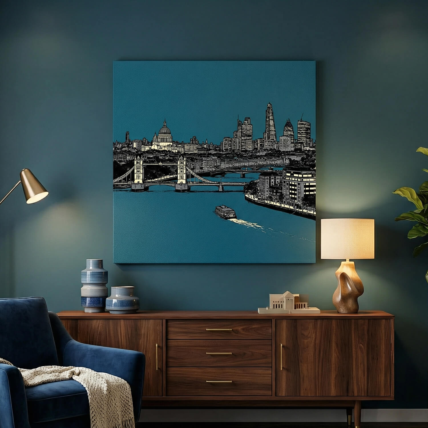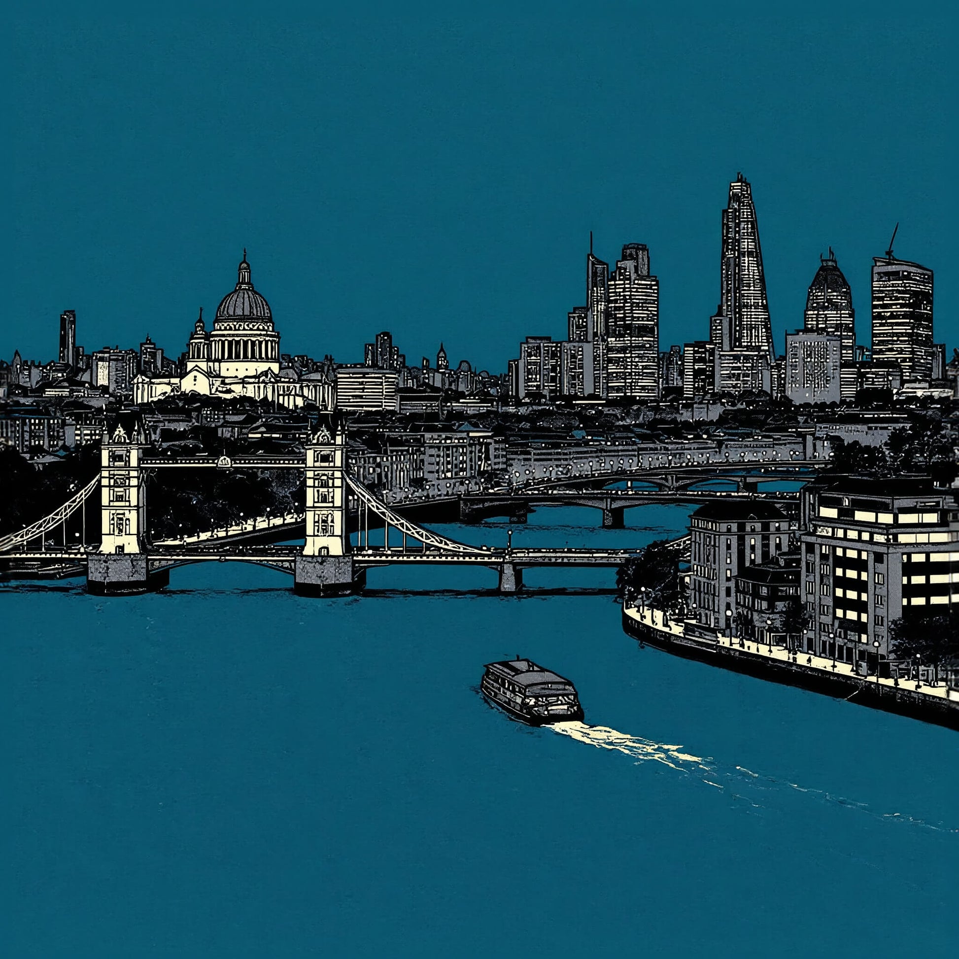 Thames Twilight captures London’s iconic skyline in bold monochrome, set against a rich teal backdrop for a contemporary edge. Tower Bridge spans the River Thames in crisp architectural detail, while St Paul’s Cathedral and the modern city towers rise confidently beyond. The strong contrast and graphic style give the piece a clean, modern feel, while the flowing river and passing boat add movement and depth to the composition.