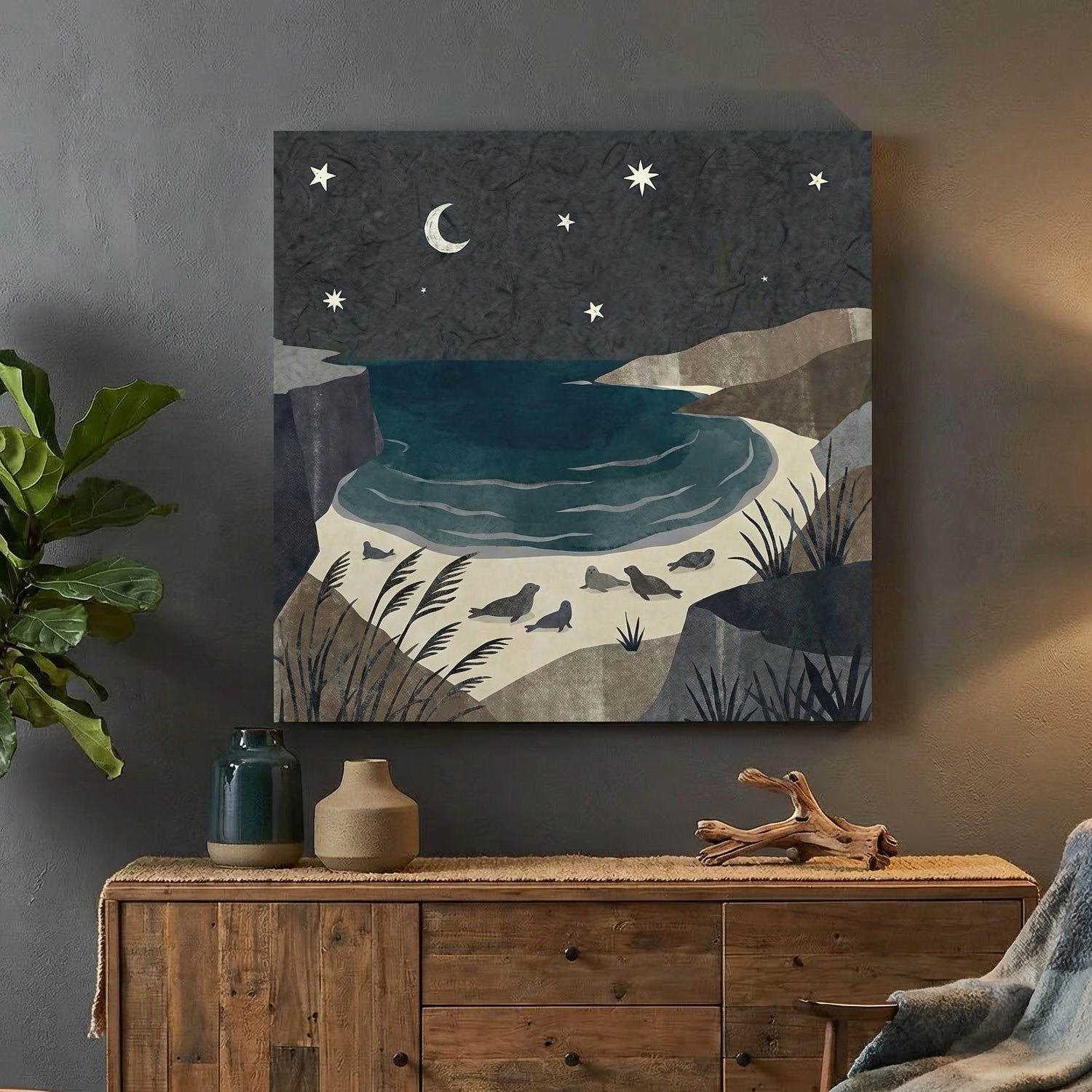 Twilight Cove captures a peaceful coastal cove beneath a star-filled night sky. A crescent moon and scattered stars glow softly above deep teal waters, while gentle waves meet a quiet sandy shore. A group of seals rest along the beach, framed by rocky cliffs and windswept grasses that add depth and texture to the scene. The muted palette of navy, slate, sand, and sea green creates a calming, storybook quality that feels both serene and timeless.