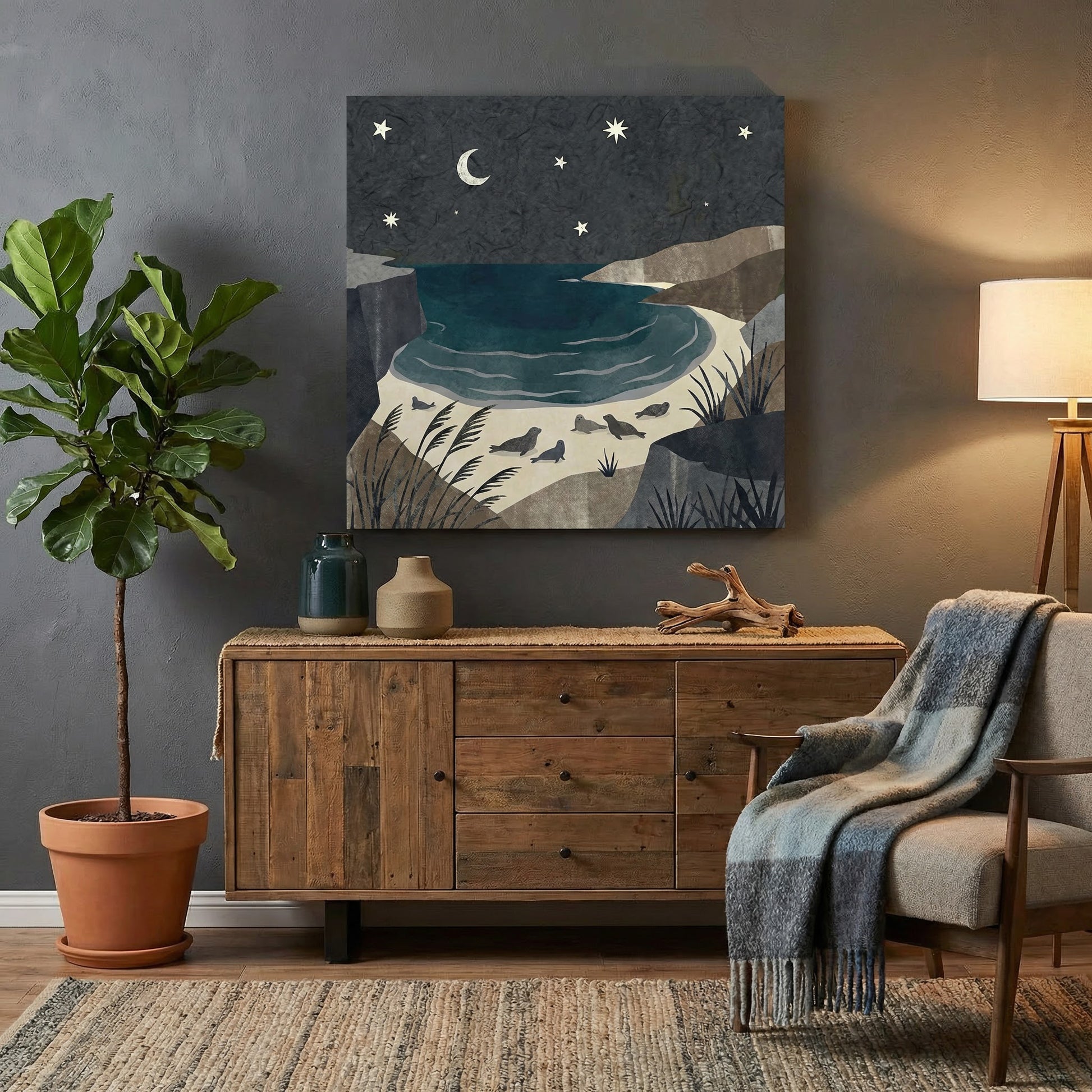 Printed on canvas, this artwork is perfect for a cosy living room, tranquil bedroom, nursery, or relaxed coastal-inspired space. It pairs beautifully with natural wood furniture, soft lighting, and textured fabrics, bringing a sense of calm, warmth, and quiet wonder to your home.